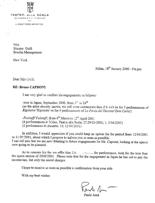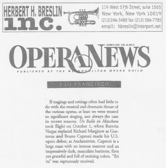 Bruno Caproni has appeared in many of the major opera houses including the Royal Opera Covent Garden, Metropolitan Opera, Vienna Staatsoper, La Scala Milan, Deutsche Oper Berlin, Komische Oper Berlin, English National Opera, Welsh National Opera, the opera companies of Houston Grand Opera, Pittsburgh Opera, Dallas Opera, San Diego Opera, Florida Grand Opera, Staatsoper Hamburg, Oper Frankfurt, Deutsche Oper am Rhein, Aalto Theater Essen, Nationaltheater Mannheim, Vlaamse Opera, Oper Du Rhin, Teatro Verdi Trieste, Teatro Goldoni Livorno, Politeama Greco Lecce, Teatro Sociale Rovigo, Teatro Comunale Vicenza as well as the Casals Festival Puerto Rico, Wexford Festival and the Klangbogen Wien.